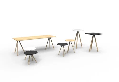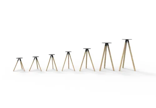 The idea is to either use one or two legs construction under table top. One legs is making a triangle with three legs sticking out from metal plate, that is screwed to a table top of own chosie. One leg construction is suitable for smaller coffee tables in small kitchen or on the balcony, lower sofa or side tables. When used 2 legs together there can be used longer table top like dinner tables or exhibition table in height of 90 cm.