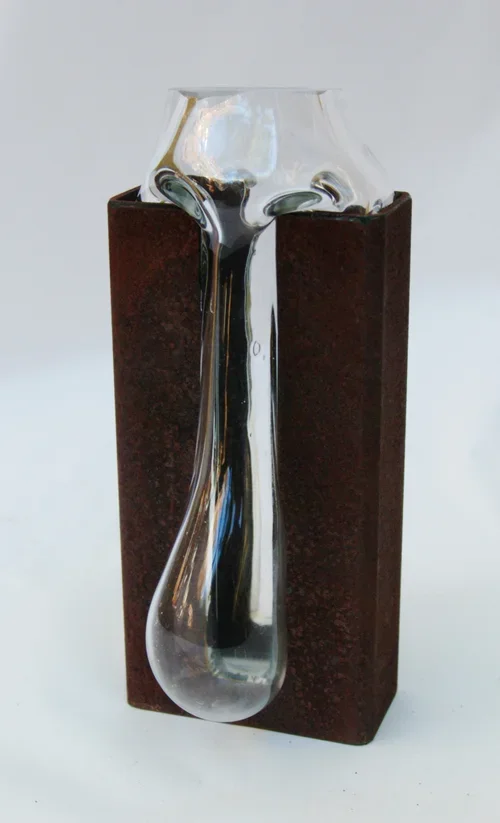 The vases started as an experimental work with blowing glass into blackened metal plates that had been bent, as well as blowing glass into rusted and weathered metal tubes and squares with holes and gabs. This created these sculptural vases.
