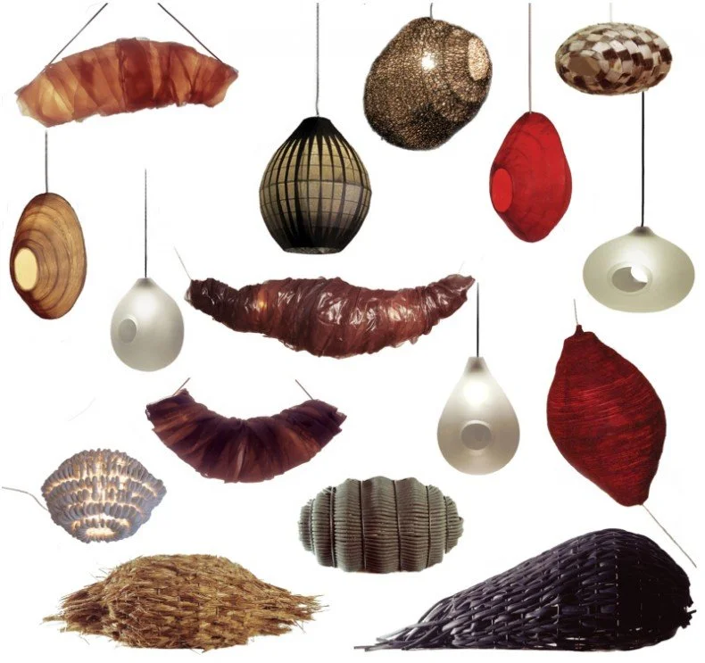 The chaotic structure of red wool contained a number of pupae shaped lamps made of a mixture of natural and synthetic materials. Steel, wool, glass, silk, gaff tape, sealskin, grass, rubber, polyester, plastic, paper, organza and DAS clay.