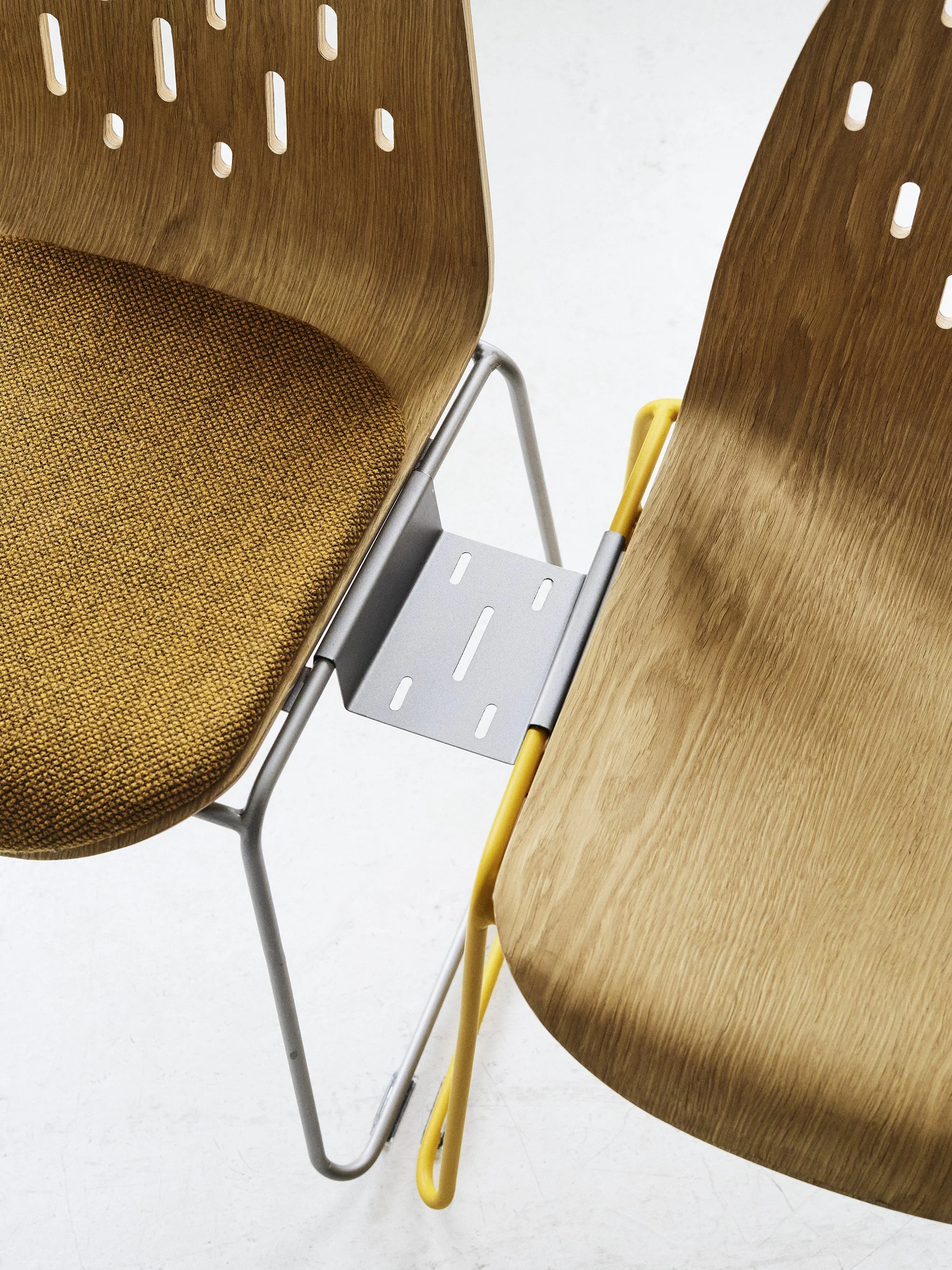 “But the Sophia Chair is more than a story. It is highly functional. The chair is lightweight, easy to stack in large numbers, and transportable on trolleys. A discreet linking system allows the chairs to be connected in rows, while a small curved plate doubles as a resting place for handbags or mobile phones.