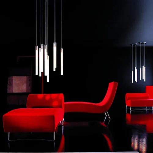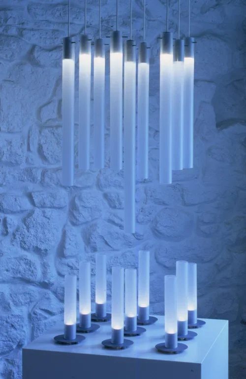 The idea for Tuba came while working with the tubes for the Ice Cube lamp. It was first designed for an Icelandic exhibition, before being produced by Ligne Roset. The tubes hang at various lengths which are reminiscent of the columnar basalt seen at the Svartifoss waterfalls in Iceland.