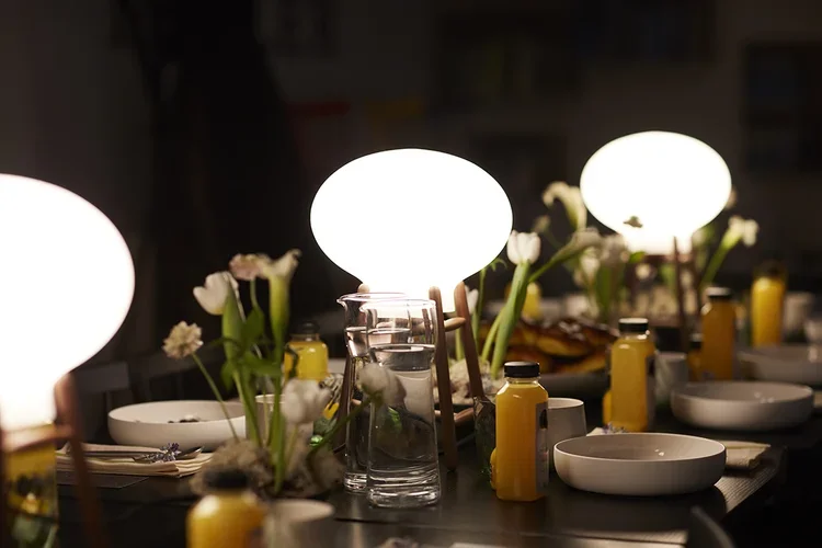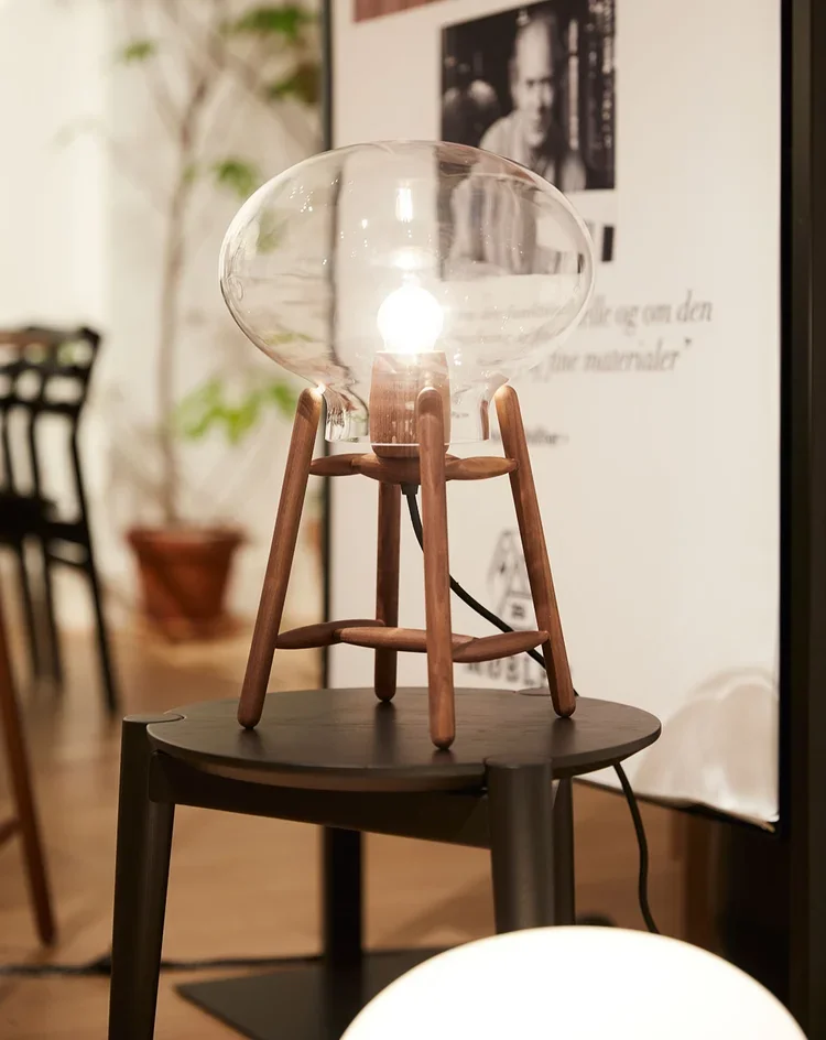 The HITI table lamps are hand blown glass ‘ballones’ pressed a little flat and placed on a wooden structure inspired by classic danish designer Poul W.